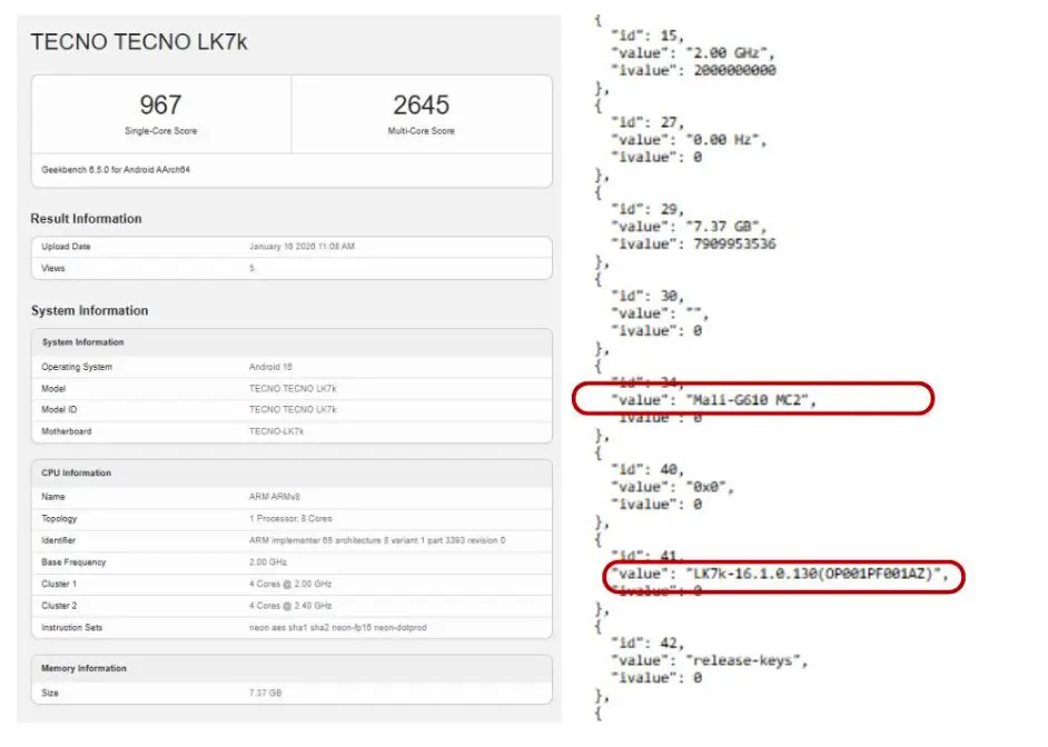 Sul fronte connettività, il dispositivo supporta un`ampia gamma di standard, inclusi GSM, WCDMA, LTE e 5G NR, oltre a Wi-Fi dual-band su bande 2.4GHz e 5GHz, e Bluetooth. Geekbench fornisce ulteriori indizi sulle performance: con un punteggio single-core di 967 e multi-core di 2645, il telefono monta il MediaTek Dimensity 7100, un processore octa-core con quattro core a 2.40GHz e quattro a 2.00GHz, abbinato alla GPU Mali-G610 MC2. Tutto gira su Android 16, un sistema operativo fresco che dovrebbe garantire aggiornamenti fluidi e ottimizzazioni software avanzate.